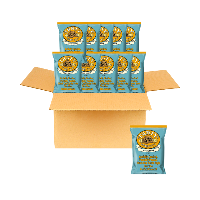 Dirty Potato Chips Maui Onion 2oz pack a bold, sweet onion flavor with a hearty crunch. Cooked in small batches for a richer taste, they’re the perfect snack for lunches, break rooms, or on-the-go munching.
